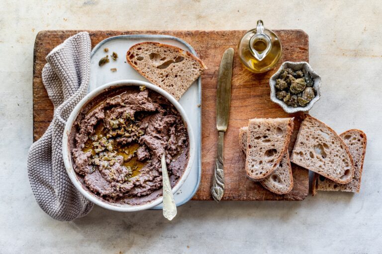 For your antipasto, which is the plate usually served before the pasta dish is Crostini coi fegatini, a classic tuscan plate of chicken liver pate.